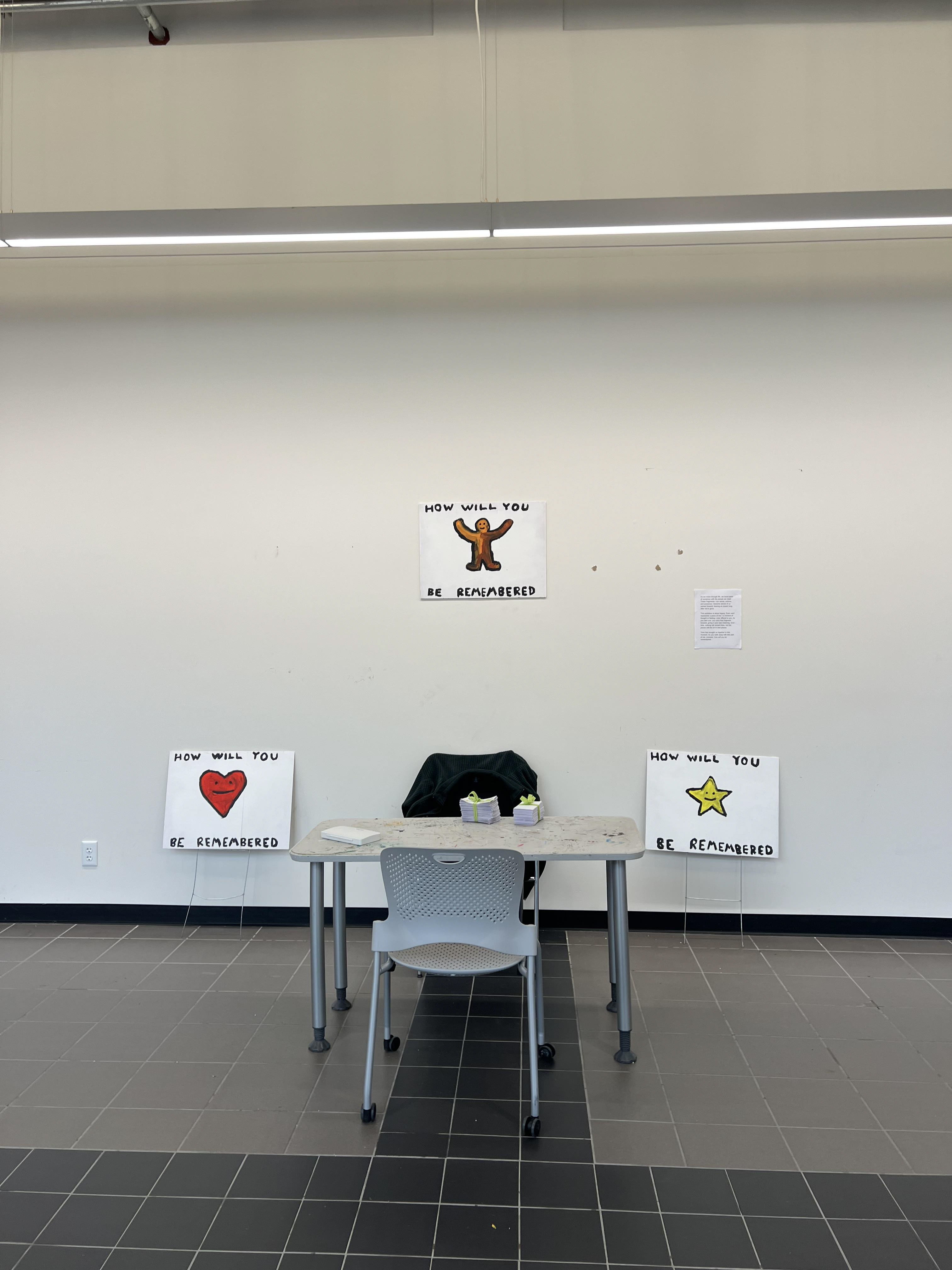 The original exhibition was titled: "How Will You Be Remembered?" and took place in the Shaffer Art building on Syracuse Campus. I sat accompanied with the following text: